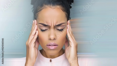 Woman experiencing severe headache with motion blur effect in pastel background