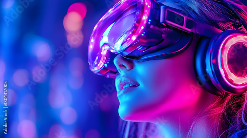 Woman Experiencing VR in Neon-Lit Cityscape