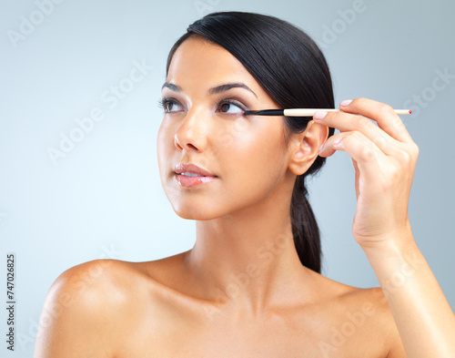 Woman, eye and brush for beauty, makeup and thinking of cosmetic, idea or vision on white background. Female person, confident or eyeshadow for cosmetology, glow or flawless skin as elegant aesthetic