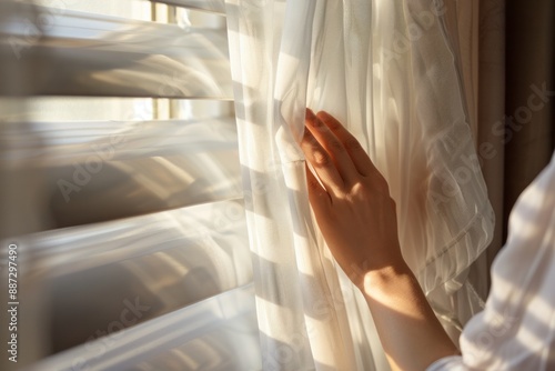 Woman hand close curtain from daylight at bedroom