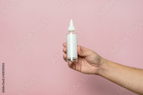 Woman hand holding cosmetic bottle. Cosmetic product branding mockup. Daily skincare and body care routine.