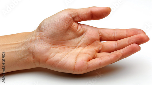 Woman hand showing open palm gesture on white background
