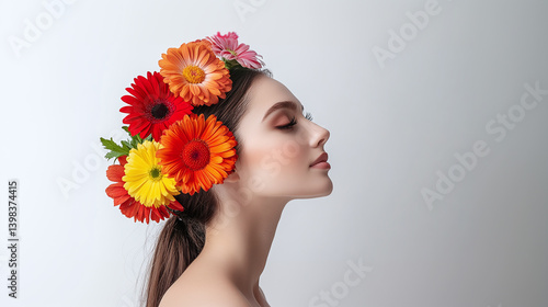 Woman head with colorful fresh flower on white background. Peace of mind, emotional balance, positive thinking
