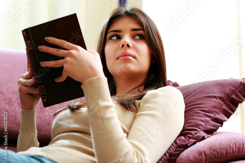 woman holding a book and looking away at home