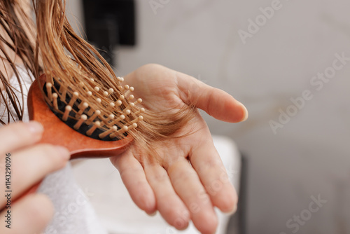 Woman holding a strand of hair with damaged, dry, split ends, close-up. Hair care concept. Beauty and health. Treatment