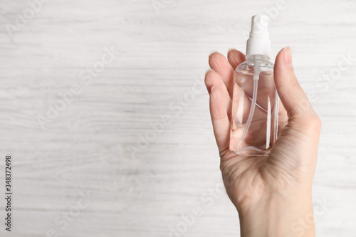 Woman holding antiseptic spray on light background, closeup. Space for text