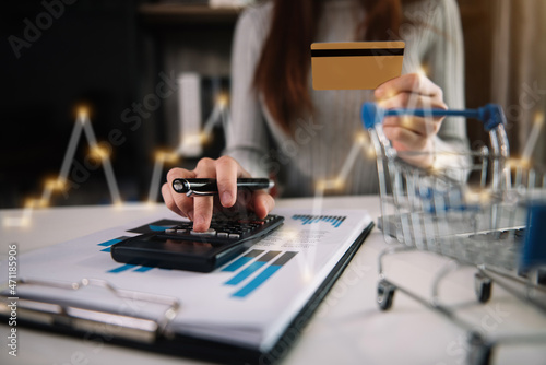 Woman holding credit card and using smart phones.Businesswoman working at home. Online shopping, e-commerce, internet banking, spending money, working from home concept.