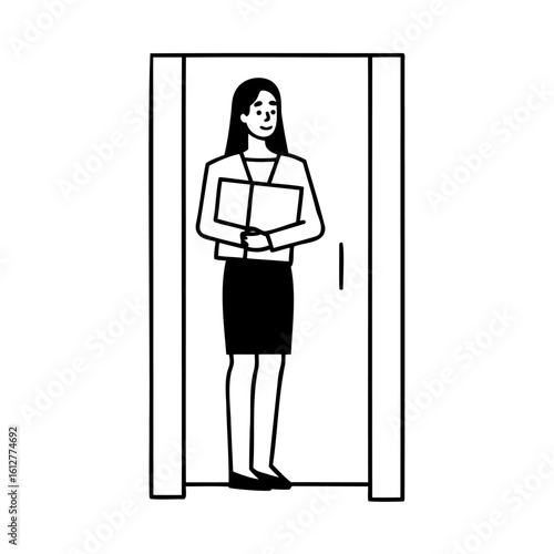 Woman holding documents inside a doorway standing