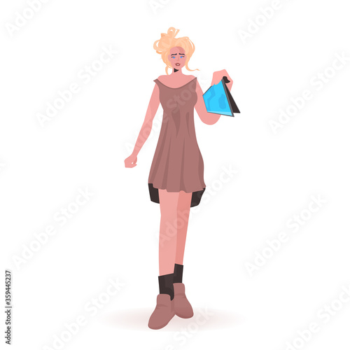 woman holding tablet pc beautiful girl model in trendy clothes female cartoon character standing pose full length isolated vector illustration