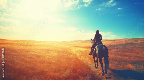 Woman horseback riding at sunset across a field.
