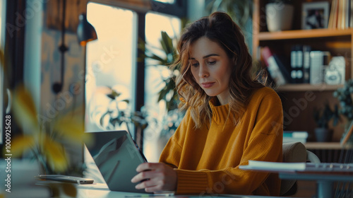 woman in cozy sweater is focused on her tablet while sitting in bright, plant filled workspace. warm atmosphere enhances her concentration and creativity