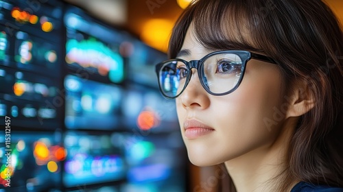 Woman in glasses analyzes data on screen.
