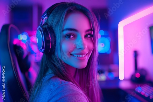 Woman in her 20’s taking a selfie at her gaming station, Generative AI