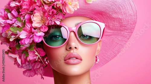 Woman in pink hat and sunglasses, floral headpiece, pink background; fashion, beauty