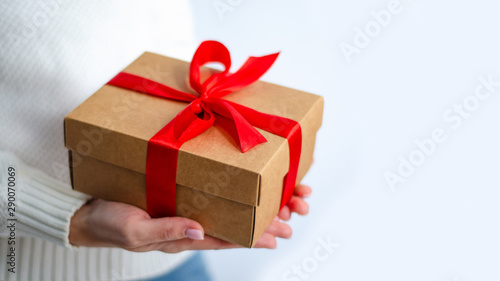 Woman in white sweater holding gift box with red ribbon in hands on white background