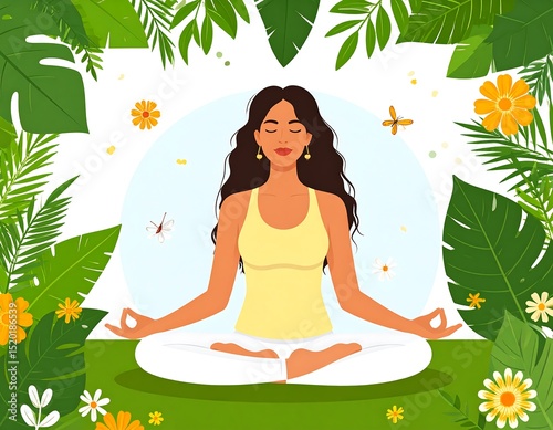 Woman meditating in a tropical garden