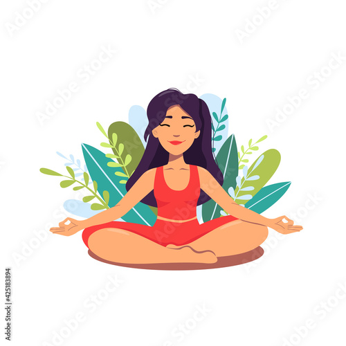 Woman meditating in the Lotus position and saying Om. Woman practising the guided meditation. Modern flat illustration on yoga topic. Woman practise meditation
