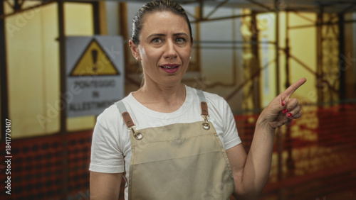 Woman points finger at building scaffolding draped with orange safety netting on an outdoor construction site; safety guidance warning caution.