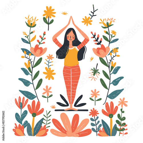 Woman practicing yoga surrounded colorful flowers. Peaceful yoga pose calm relaxing serene atmosphere. Female wellness fitness meditation garden nature