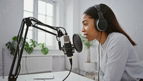Woman Recording Podcast: A focused young woman with headphones engaged in a recording session. She sits in front of a microphone and pop filter, capturing audio in a well-lit setting.