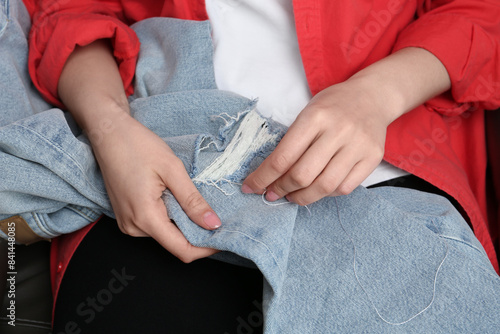 Woman sewing jeans with needle, closeup view