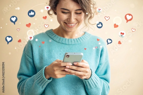 Woman smiling at her phone receiving social media engagement reactions