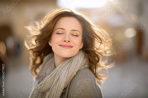 Woman spinning happily on city street with long scarf flowing in the breeze. Sunlight creates a dreamy atmosphere with soft flares. Concept of happiness, urban lifestyle, wellness