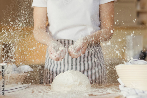 Woman sprinkling flour on dough at home