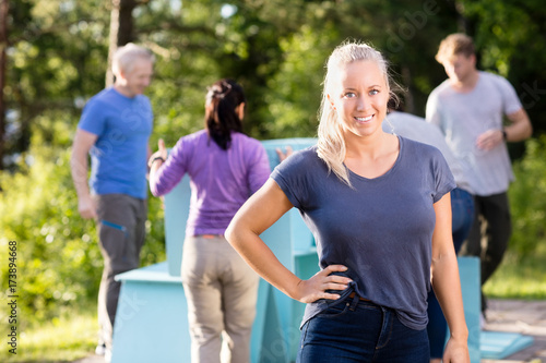 Woman Standing With Hand On Hip While Friends Making Pyramid