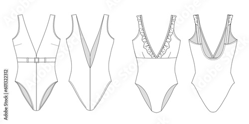 Woman sustainable swimwear, technical drawing, template, sketch, flat, mock up. Recycled PA, Recycled PES, Lycra fabric. Swimwear fashion front and back view, white color