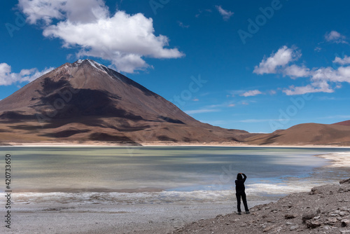 Woman taking a photo of a volcano and a lake in the Andean Highlands