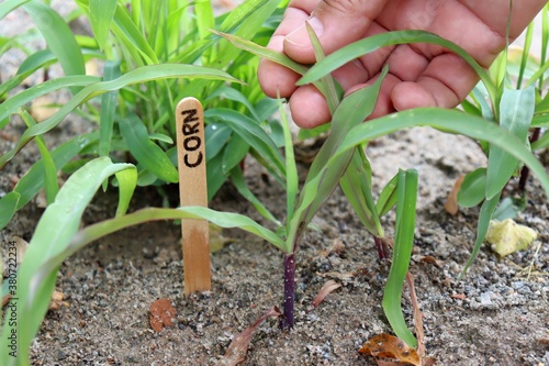 Woman taking care of the corn plant. Young corn plants growing.
