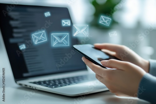 Woman using smartphone for sending emails with laptop on desk and digital icons floating around