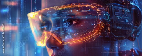 Woman wearing vr headset experiencing a virtual reality world with digital interface