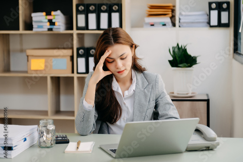 Woman who is tired and overthinking from working with tablet and laptop at modern office.