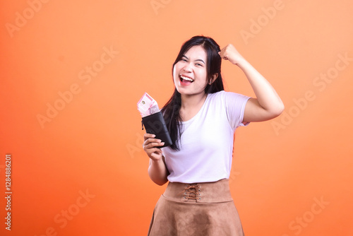 Woman with a black wallet showing Indonesian money wearing a white t-shirt and brown skirt against orange background