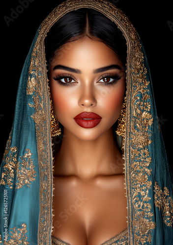 Woman with a blue head scarf and red lipstick. She has a very pretty face