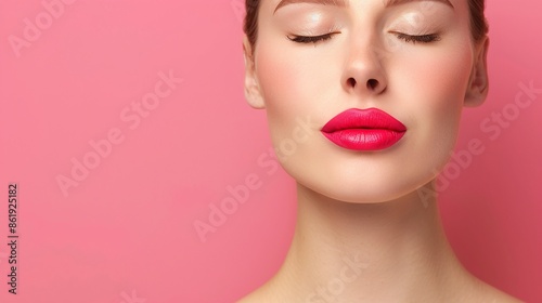 Woman with Bright Pink Lips, Eyes Closed on Pink Background, Bold and Feminine Lip Color, Beauty and Makeup Concept, Elegant and Relaxed Look, Pink Themed Portrait, Focus on Pink Lips