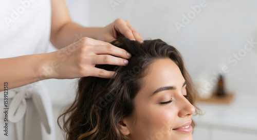 Woman with curly hair getting a relaxing head massage at a spa salon. Hair care treatment for scalp health and hair growth. Aromatherapy and wellness concept