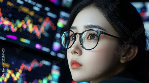 woman with glasses analyzing financial data on screen, showcasing concentration and insight. vibrant graphs and charts reflect her analytical skills and dedication