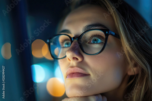 Woman with glasses gazes thoughtfully out of a window at night, illuminated by city lights