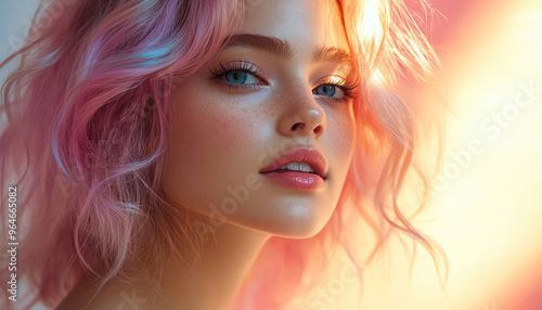 Woman with pastelcolored hair standing confidently against a vibrant rainbowstriped background