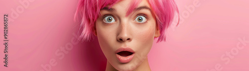 Woman with pink hair, surprised expression, bright background, playful and energetic