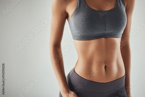 Woman with toned abdomen wearing grey athletic clothing against a light background.