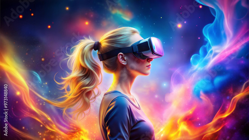 Woman with virtual reality headset, immersive experience, colorful cosmic background