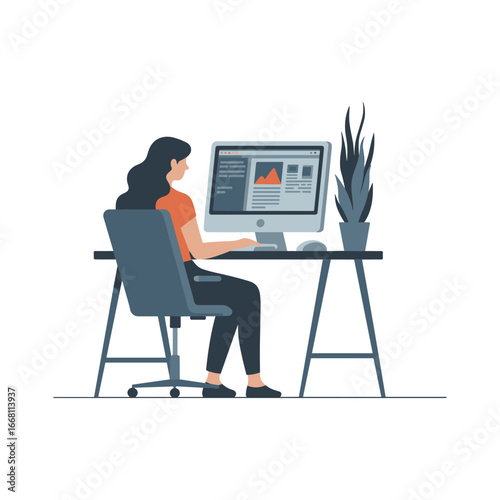 Woman working at a desk with a computer and plant developing ideas for creative projects