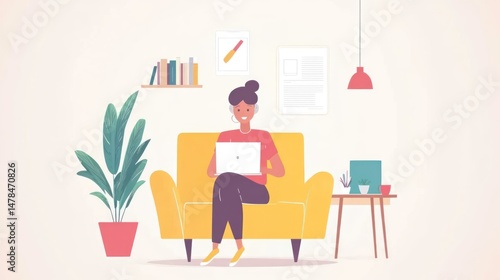 Woman Working From Home on Laptop in Cozy Living Room