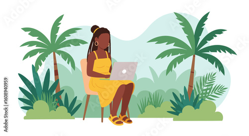 Woman working on laptop outdoors, tropical setting. Ideal for travel blogs, remote work articles, or summer lifestyle websites.