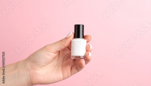 Woman's hand holding a white nail polish bottle against a soft pink background