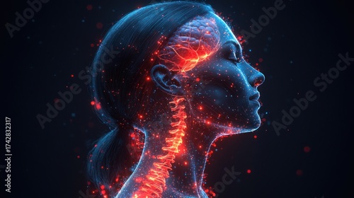 Woman's head and neck, glowing with brain and spine